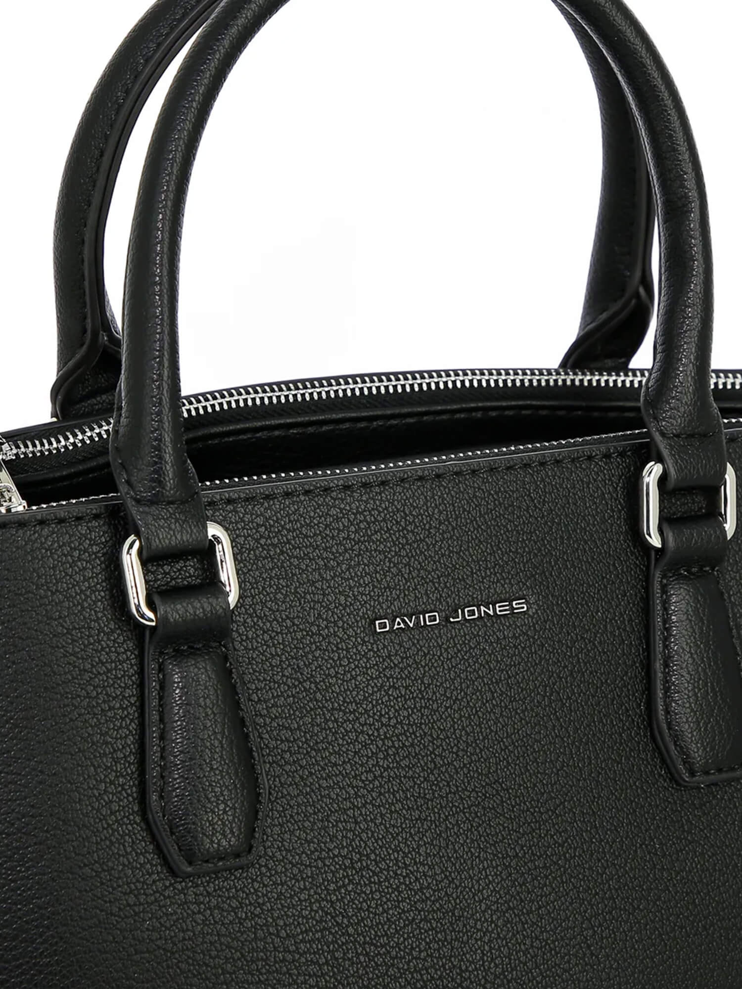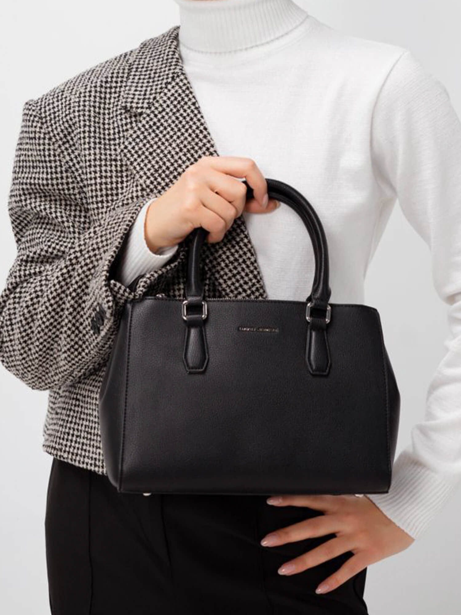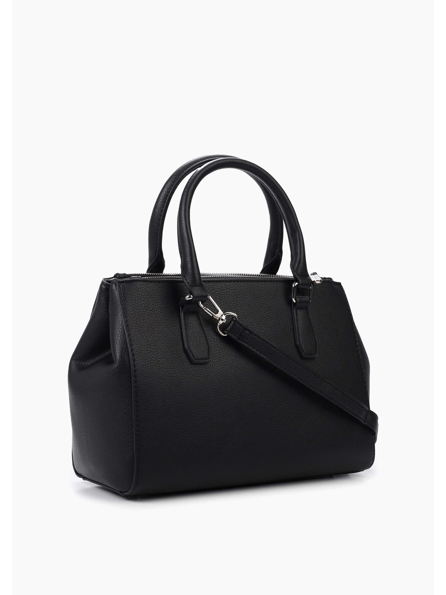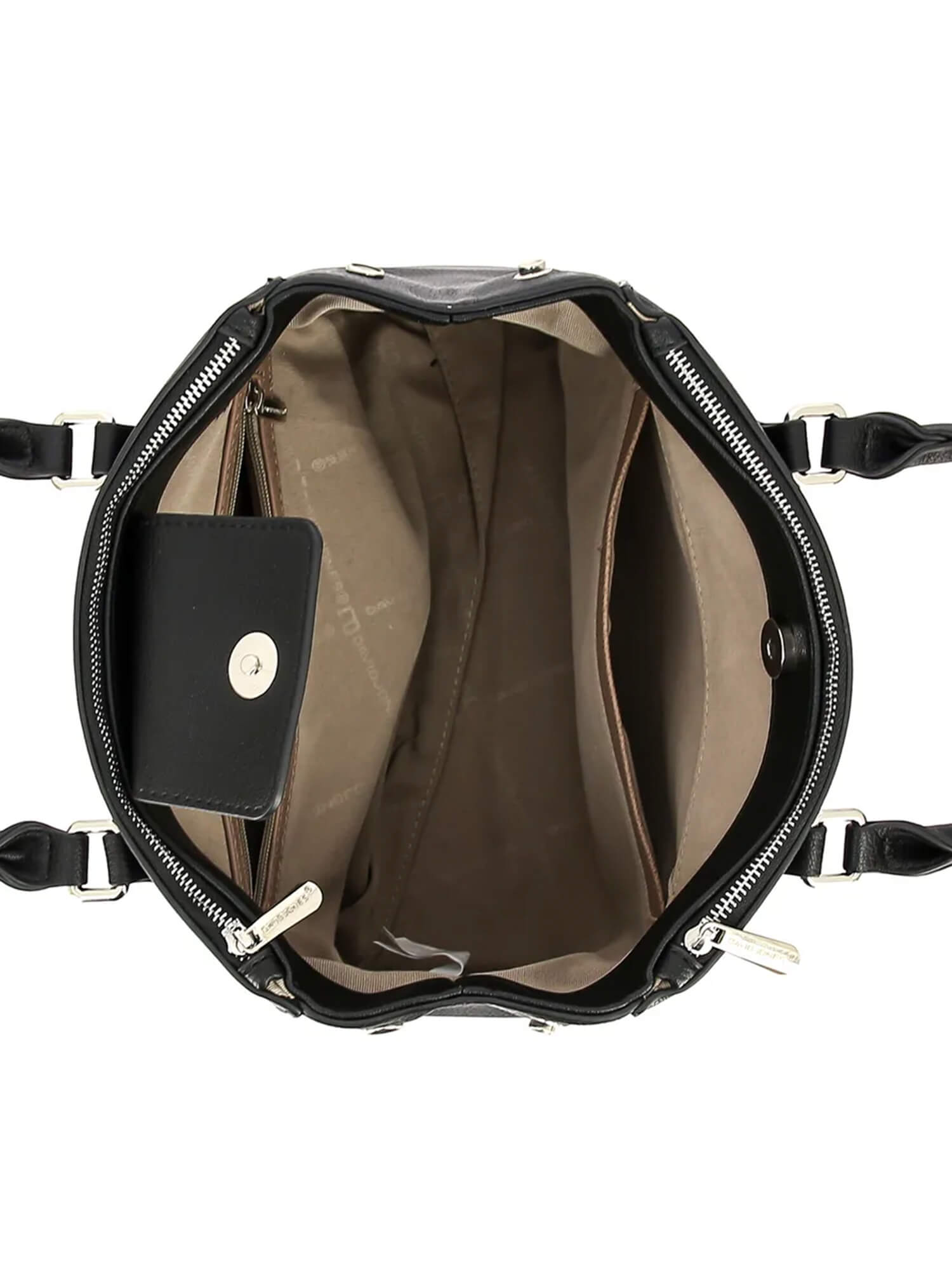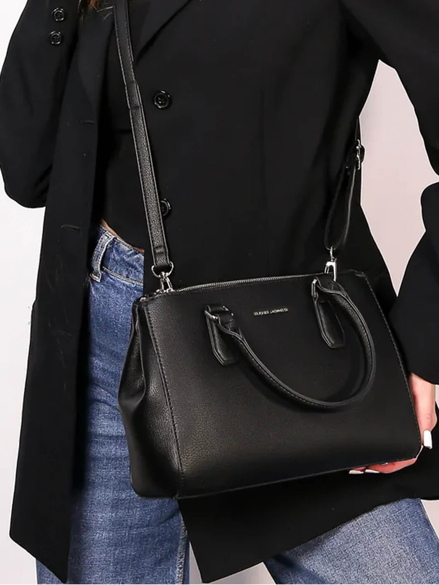 Ce sac à main élégant en cuir lisse, doté de trois compartiments avec fermeture à glissière et aimant, doublure intérieure en textile avec 2 poches, poignées de transport, bandoulière amovible.