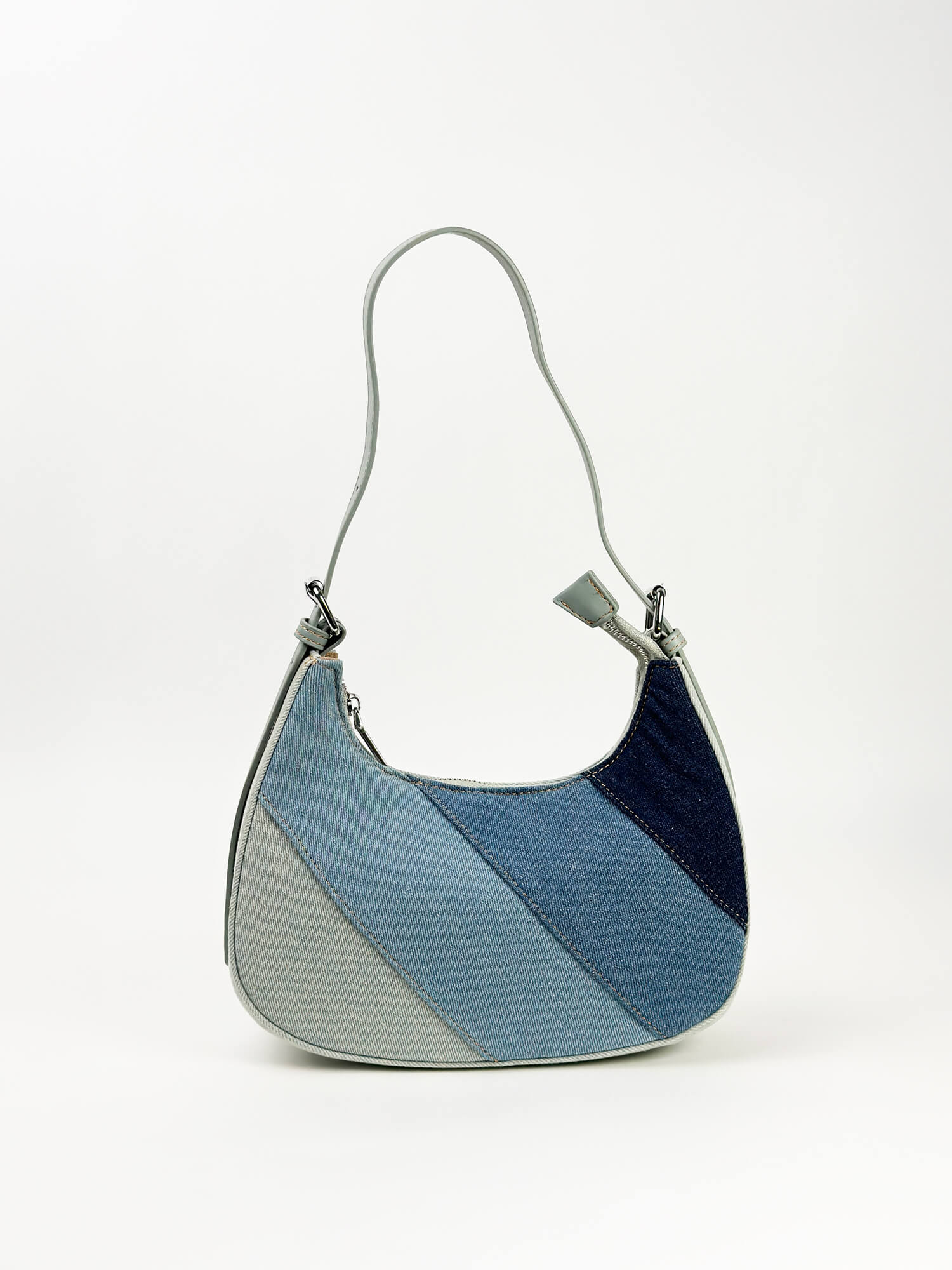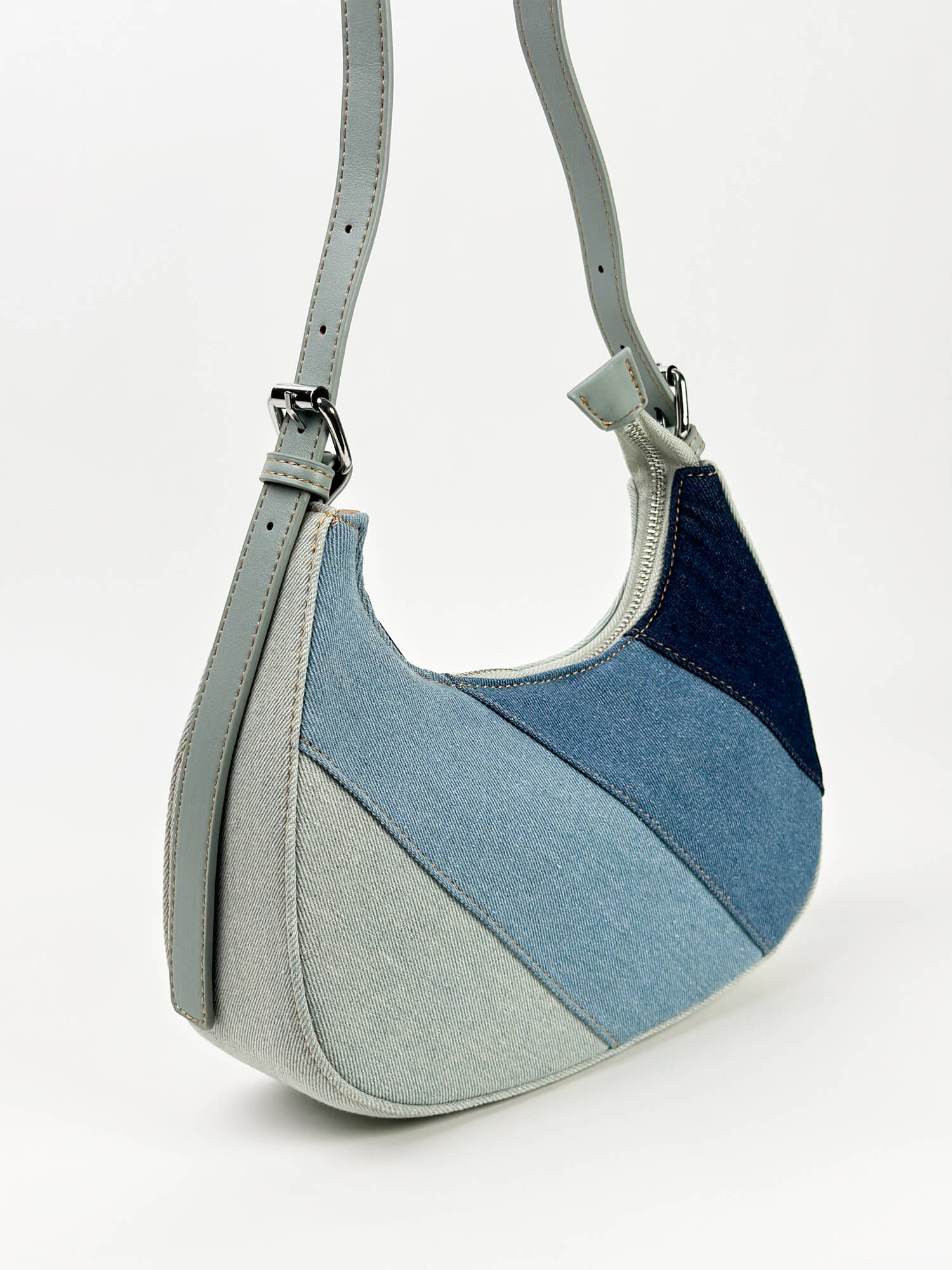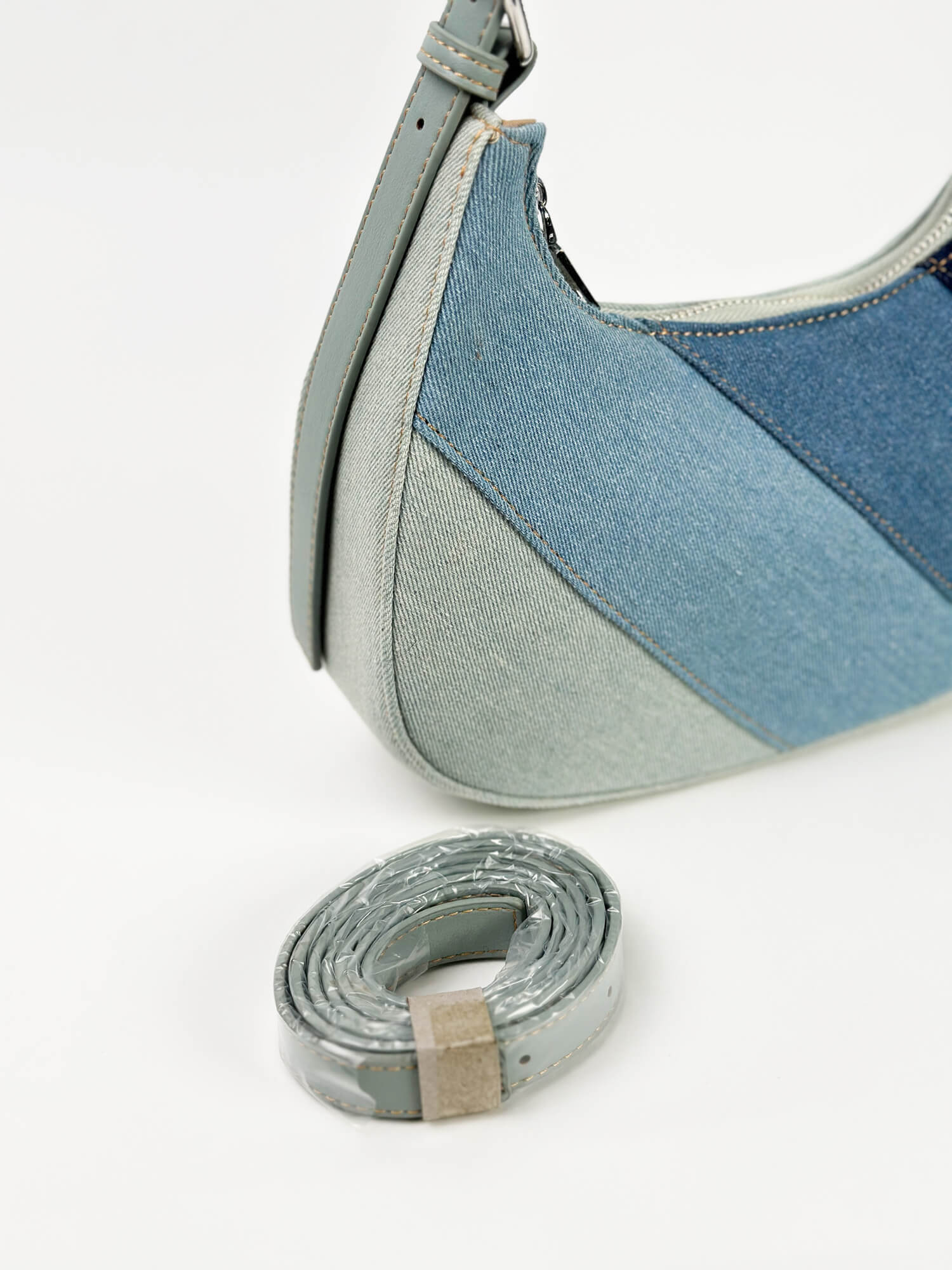 Ce sac milan en denim patchwork mélange différentes teintes de bleu pour un style unique. Doté d'une fermeture zippée, d'une anse supérieure et d'une bandoulière ajustable et amovible, il offre un porté main ou épaule selon vos envies. À la fois pratique et tendance pour toutes vos sorties.